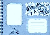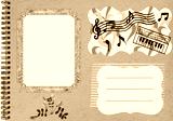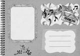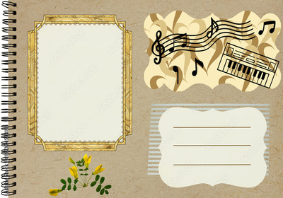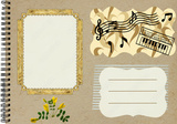 Page from an old photo album for stories. Photo album layout with empty photo frames. Scrapbooking composition with musical theme. Sheet music, piano, emotions. Music design.
