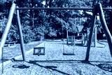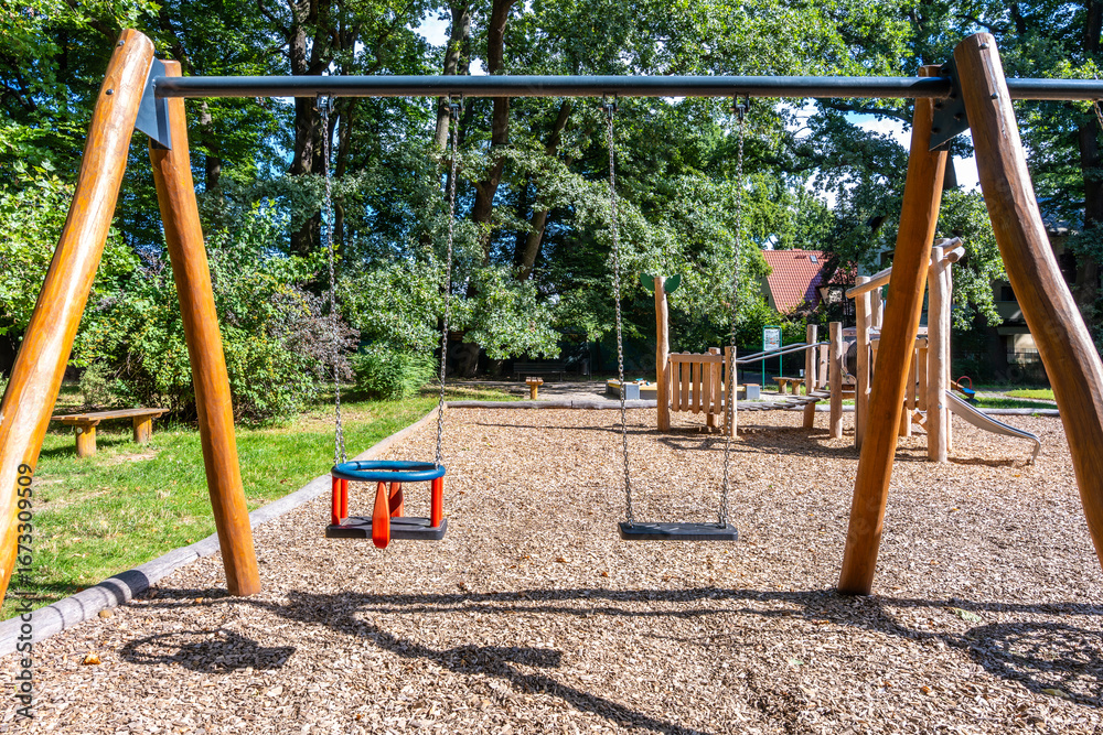 Wood Swings At Outdoor Playground In Park, Family Community Recreation With Children Equipment