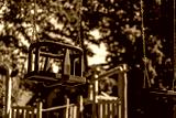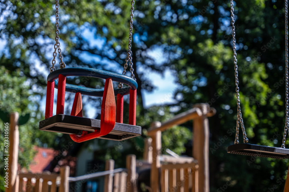 Toddler Safety Swing On Chains At Park Playground, Red Guarded Seat In Summer Sun For Children
