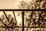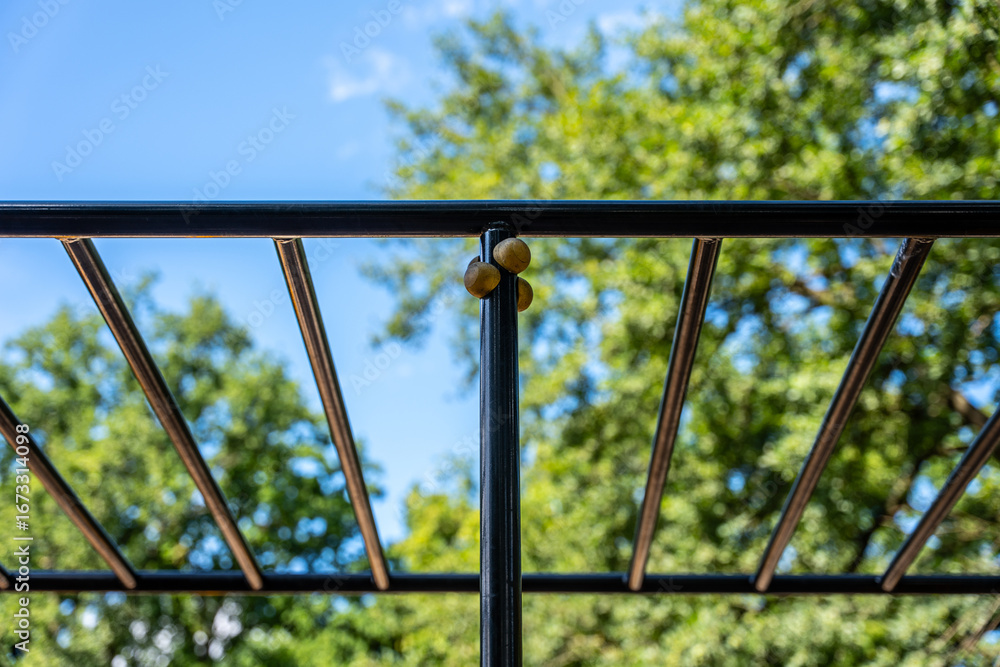 Monkey Bars And Horizontal Ladders In Outdoor Fitness Park, Steel Frame Under Trees And Sky