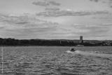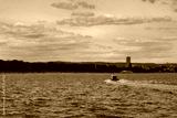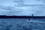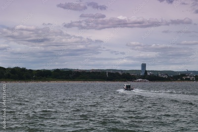 Boat navigates through cloudy waters near a coastal city under a pastel sky at dusk
