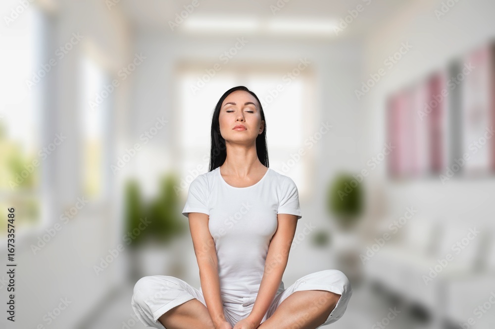 Girl do meditation and yoga in room for fitness zen
