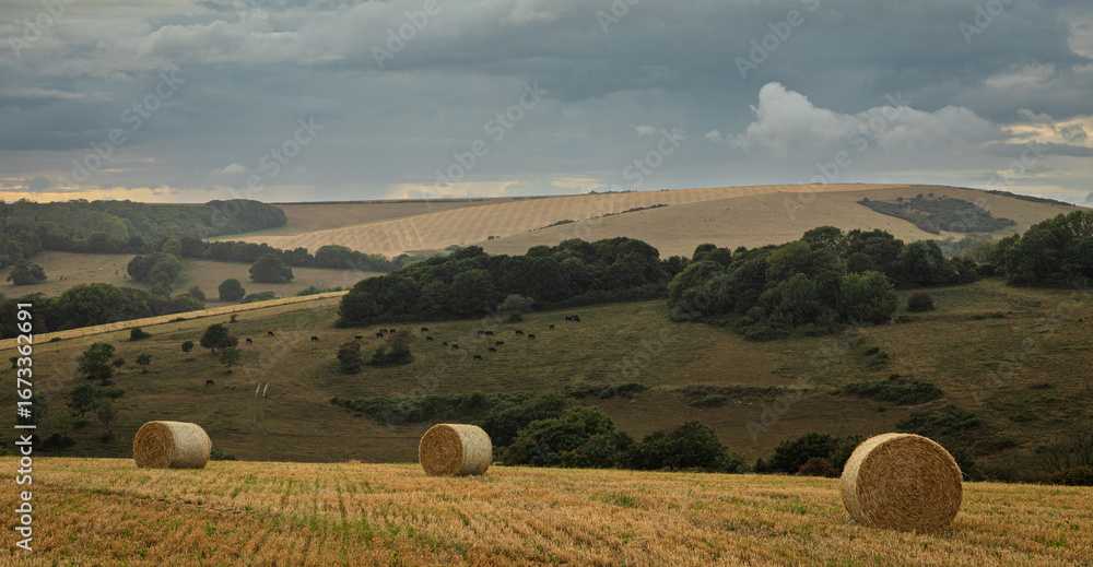 Summer harvest on the south downs from Butts Brow looking towards Jevington Church east sussex south east England