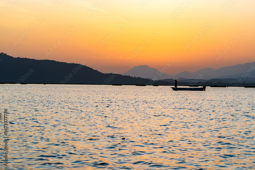 Solitary Fisherman at Sunset, Mountain Silhouette. Olomega Lagoon, El Salvador.