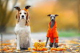 beagle and italian greyhound dogs posing for Halloween together in the park with decorations