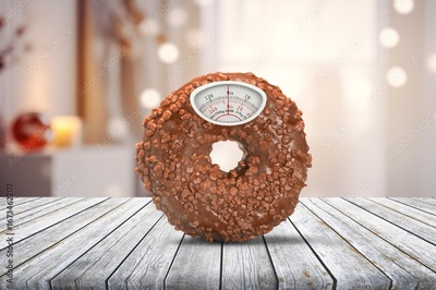 Classic weight scale on donut, food concept