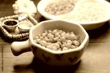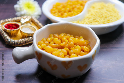 A close up of traditional Indian snacks. crispy savory sev and sweet golden boondi served together. Perfect flavors in authentic Indian namkeen and festive treats. sev bundi.