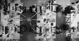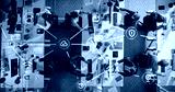 Top Down View of Employees Working in Office, Utilizing Artificial Intelligence Productivity Tools. Holographic Interface Icons Visualize Interaction and Advanced Tech Integration Within the Team