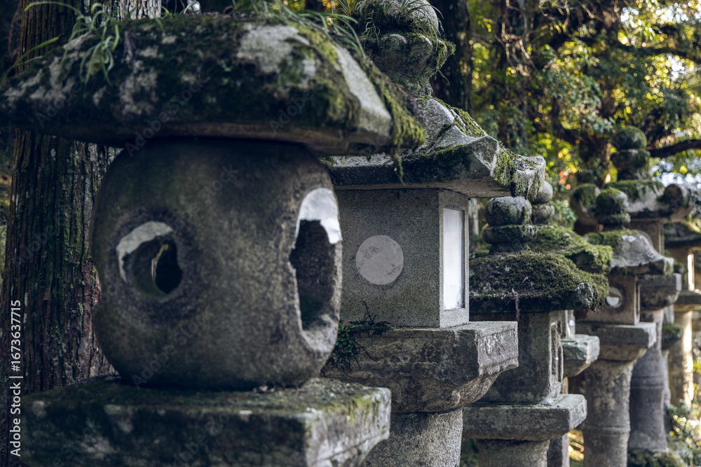 Close view of ancient moss-covered stone lanterns in Nara Park Japan captured with-film like effect highlighting weathered surfaces and serene forest atmosphere