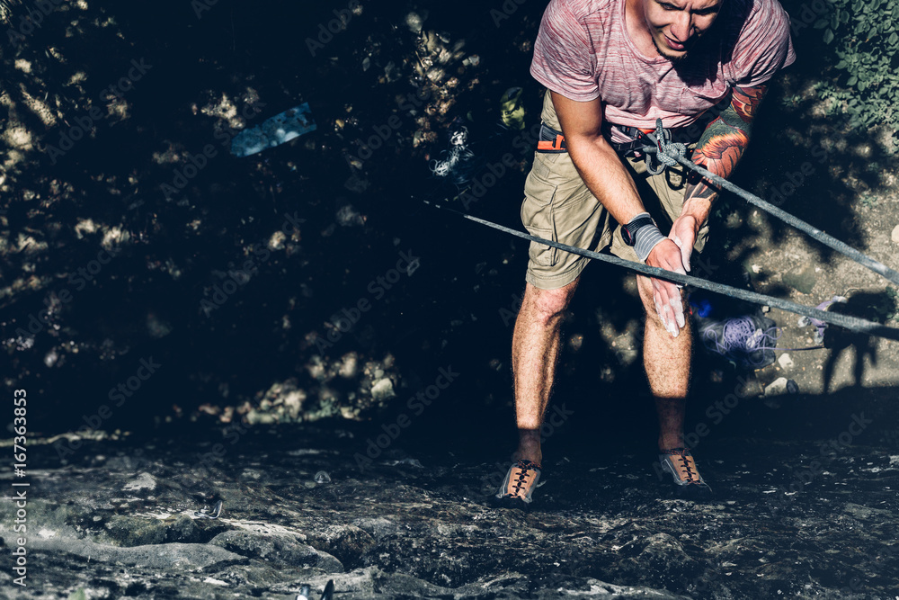 Young Male Climber Hanging On A Rock On A Rope And Looks Somewhere On The Wall. Extreme Lifestyle Outdoor Activity Concept