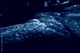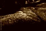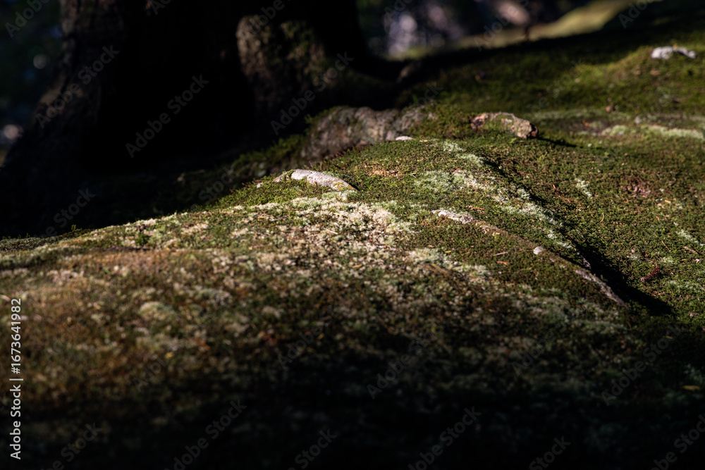 Macro photo of moss-covered tree roots with textured relief illuminated by dramatic light and shadow interplay in natural forest environment