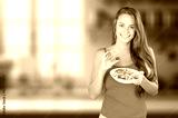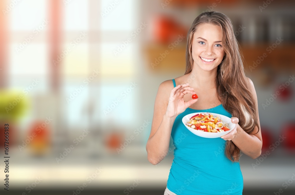 Happy beautiful woman eat healthy fruit in the kitchen