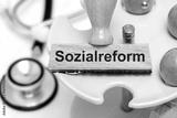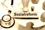 Ein Holzstempel ist beschriftet mit Sozialreform über einem medizinischen Stethoskop als Symbolbild für notwendige Reformen im Sozialsystem - FOTOMONTAGE