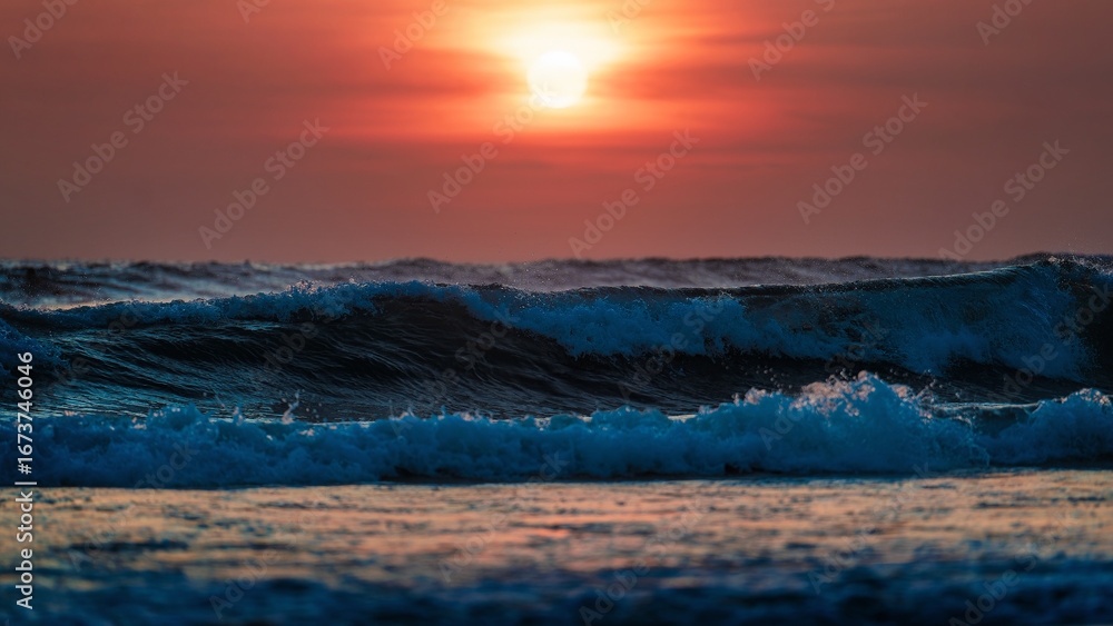 Sunset over ocean, Bali, Canggu. Travel and vacation on the beach near ocean. Sun goes dawn over waves of water