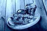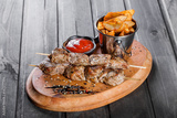 Skewers of Meat with sauce and potatoes fries in a bucket on wooden cutting board