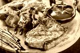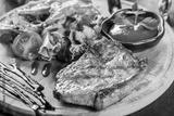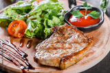 Grilled steak pork with fresh vegetable salad, tomatoes and sauce on wooden cutting board