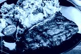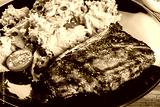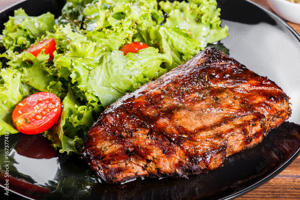 Grilled steak meat with fresh vegetable salad and tomatoes on black plate, wooden background