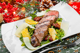 Grilled beef with orange fruit, arugula, parmesan cheese and sun-dried tomatoes on Christmas background with light. Traditional meat for Holidays. Top view