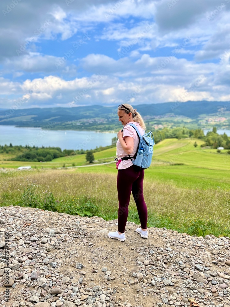 Middle aged woman enjoying panoramic view of Czorsztynskie lake and mountains with traditional poland houses in the background. Concept: freedom, joy, inspiration, eco lifestyle.