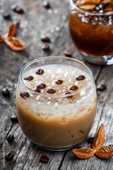Cold alcoholic cocktail with coffee and ice in glass on wooden background. Summer drinks and alcoholic cocktails