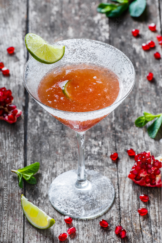 Fresh fruit red cocktail with mint, pomegranate, lemon in glass on wooden background. Summer drinks and alcoholic cocktails.