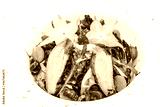 Fresh salad with chicken breast, arugula, lettuce, cauliflower, physalis and carambola on plate on wooden background close up. Top view