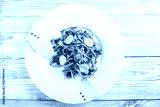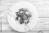 Salad with beef steak, baby spinach, lettuce, sweet pepper and grains of pomegranate on wooden background close up. Top view