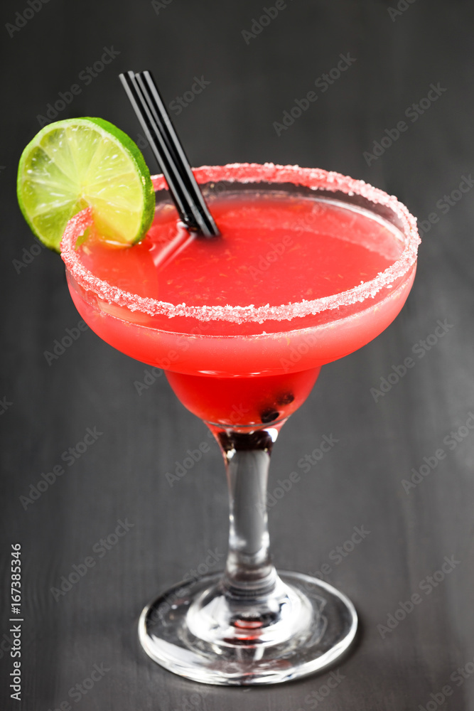 Fresh watermelon cocktail with lime in wineglass on black wooden background. Summer drinks and alcoholic cocktails
