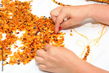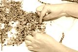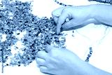 Amber. The process of making beads from sun stone with the help of thread and needle. Hands of the master select pieces of amber for jewelry. Production of amber beads