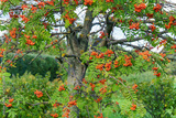 Bright orange-red rowan berries form tight clusters among pinnate green leaves. The vivid palette emphasizes the seasonal character and natural expressiveness of the tree.