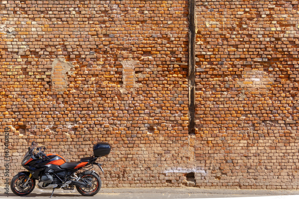 Black and orange motorcycle parked on asphalt in front of a brick wall with cracks and weathered details. The contrast between the vehicle and aged facade creates a striking composition.