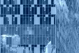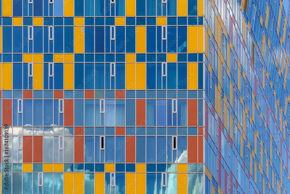 Facade of a modern building featuring a grid of rectangular panels in blue, yellow, and reddish-orange. Glass sections reflect the sky and clouds, adding a dynamic visual effect.