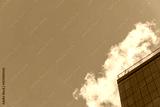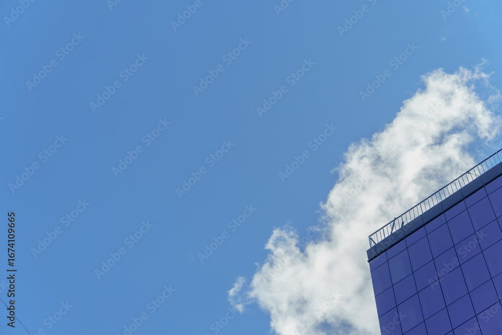 Corner of a modern building with reflective glass windows against a clear blue sky with a light cloud. Diagonal composition emphasizes the contrast between architecture and nature.