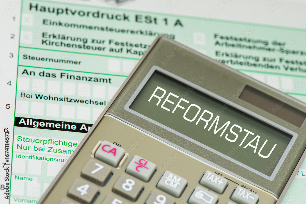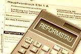 Das Display von einem Taschenrechner ist beschriftet mit Reformstau als Symbolbild für notwendige Reformen in Finanzen, Wirtschaft und Soziales - FOTOMONTAGE