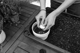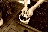 Closeup of hands arranging perlite for drainage in small flower pot as part of home gardening preparation on a wooden table