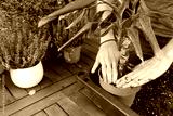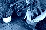 Hands repotting green leafy indoor plant into blue pot with fresh substrate, eco-friendly home gardening and plant care activity outdoors, closeup view
