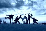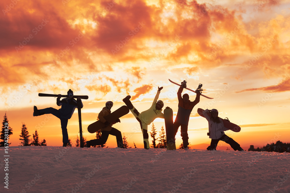 Silhouettes of one skier and four snowboarders in different funny poses against a colorful sunset sky. Winter holidays at ski resort