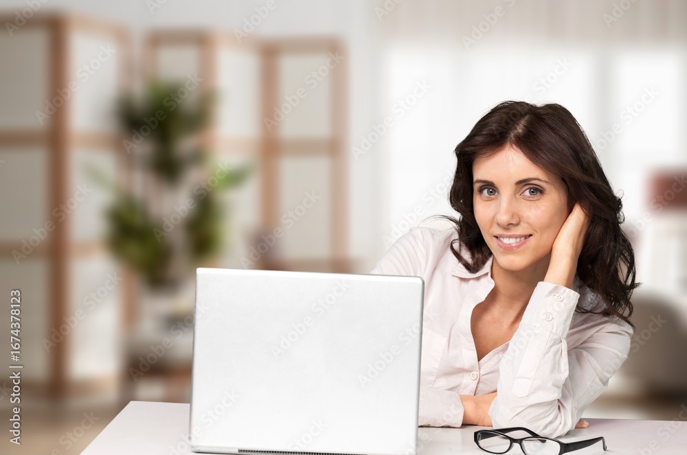 Happy smiling business woman using computer