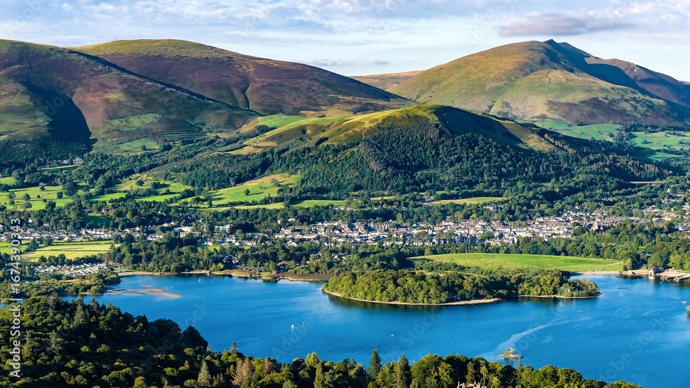 Aerial drone view of Keswick and Derwent Water at golden hour in summer