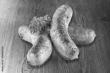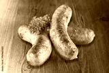 Tasty hot grilled sausages on wooden desk