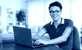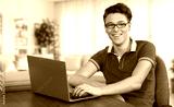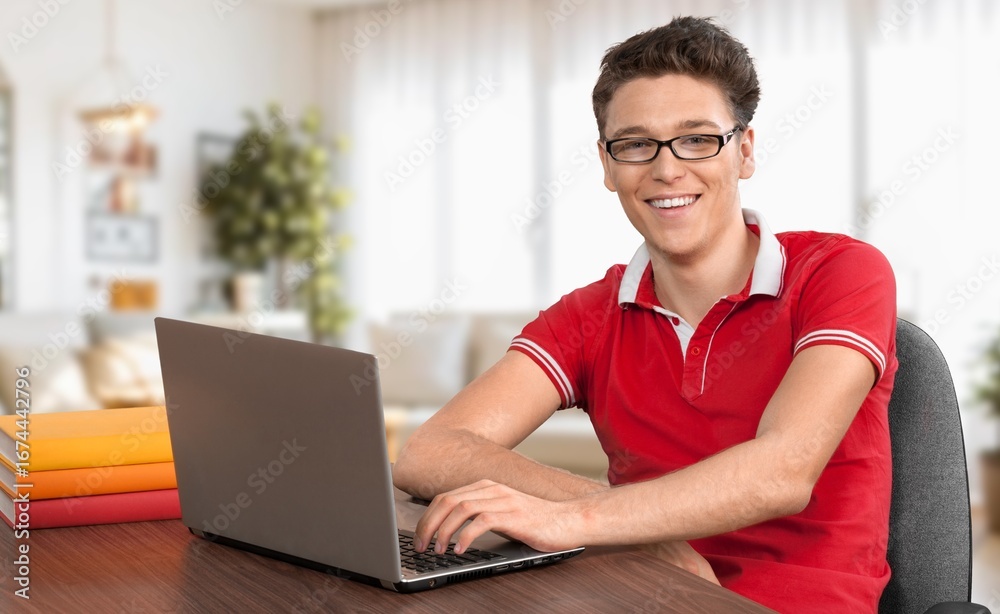 Happy teenager guy studying with laptop computer