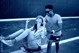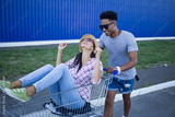 Happy young couple riding on trolley on empty mall parking , hipster friend have good time during shopping, couple in love riding on shopping cart
