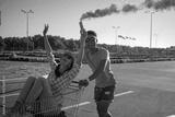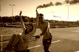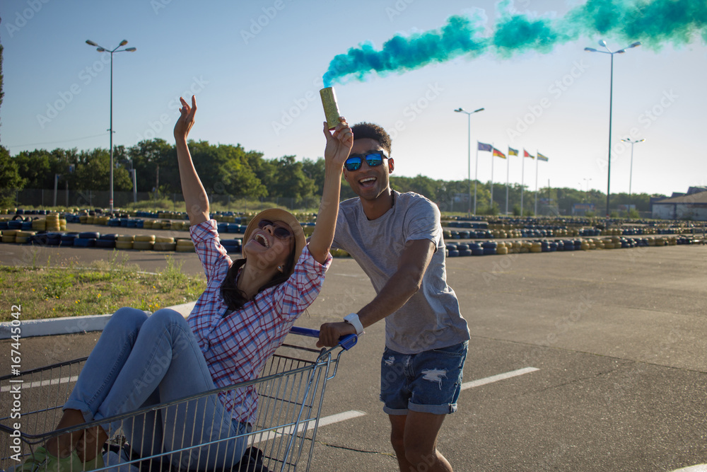 Young beautiful couple in love, boyfriend and girlfriend ride on shopping cart with blue smoke bomb, hipsters having fun in city mall