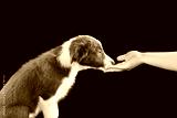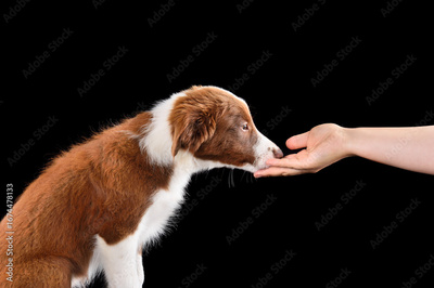 Woman holds out his hand to the puppy