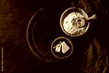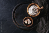 Fresh organic broken yeast cube, olive wood bowl of flour for baking homemade bread. With scoop, serving board, textile over black burned wooden background. Top view with copy space