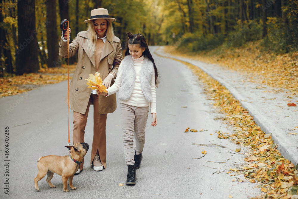 Mother and her daughter with a little puppy french bulldog in a park