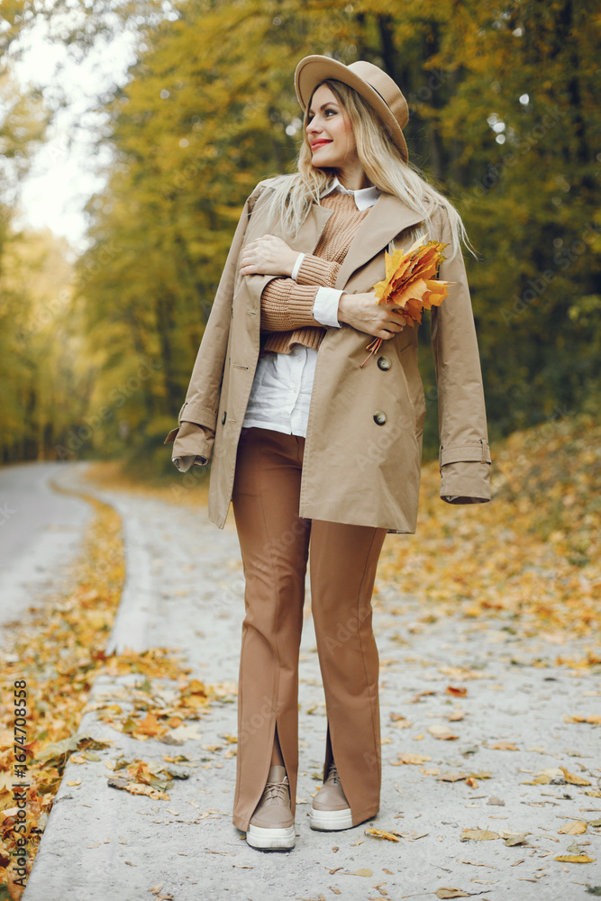Portrait of a young blonde girl in a beige hat outdoors on autumn