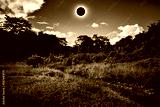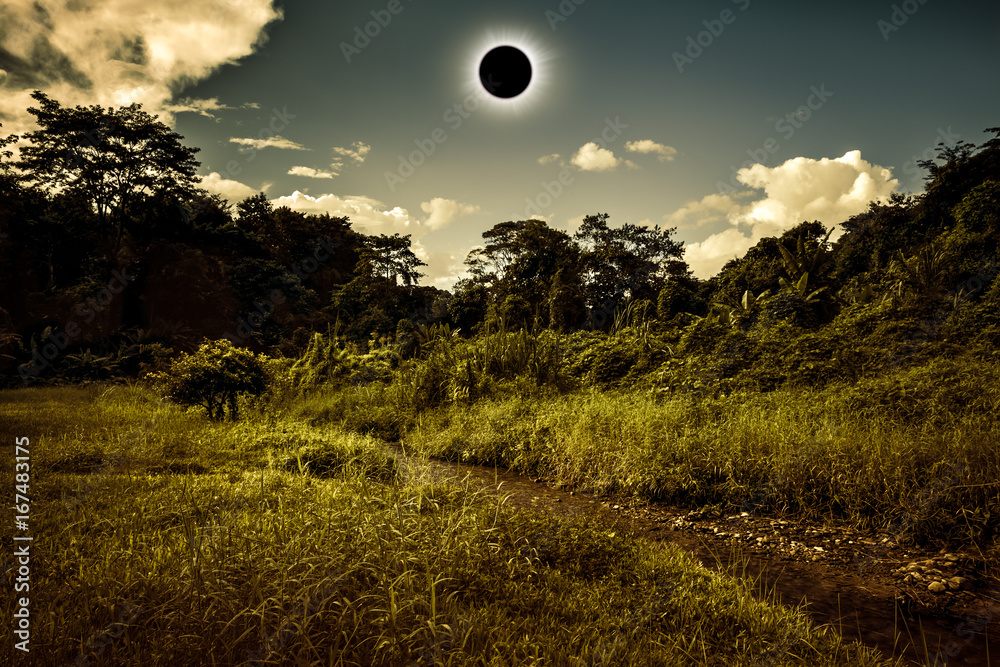 Scientific natural phenomenon. Total solar eclipse glowing on sky in forest.