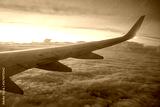 Overlooking clouds during sunset while flying above the horizon in an airplane