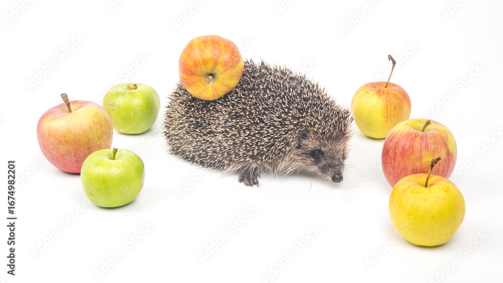 Hedgehog exploring its surroundings among colorful apples in a light setting